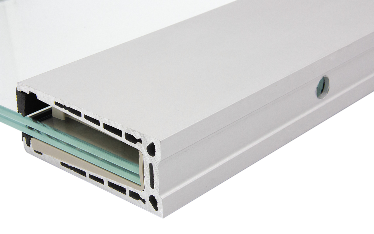 Профиль крепится на горизонтальную поверхность через отверстия просверленные в нижней части профиля. Также профиль может быть смонтирован к боковой поверхности. Стекло вставляется сверху, зажимается распорными клиньями через уплотнительные резиновые прокладки. монтажный паз профиля закрывается резиновой накладкой. Накладки под любую толщину стекла - от 10 до 16мм входят в комплект поставки. Дополнительно можно приобрести декоративные накладки из полированной стали и торцевые заглушки.