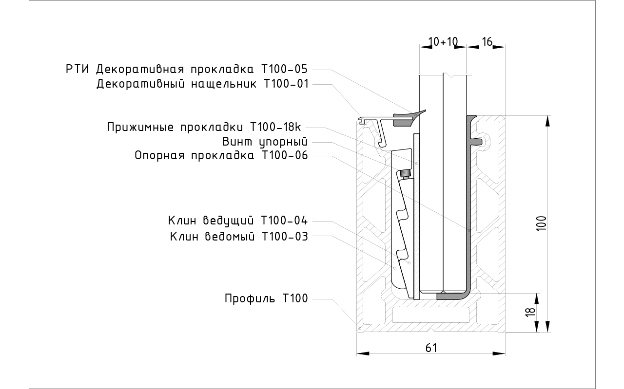 Конструкция данных зажимных систем существенно отличается от существующих на рынке. Основным техническим решением в данных системах — стало увеличение высоты прижимного клина. В аналогичных профилях, что уже существуют на рынке, высота прижимного клина 50-55мм, тогда как в профиле т100 — 80 мм. Крепежные отверстия гарантирует более удобную и быструю установку профиля на объекте, это уменьшает время и затраты на монтаж.