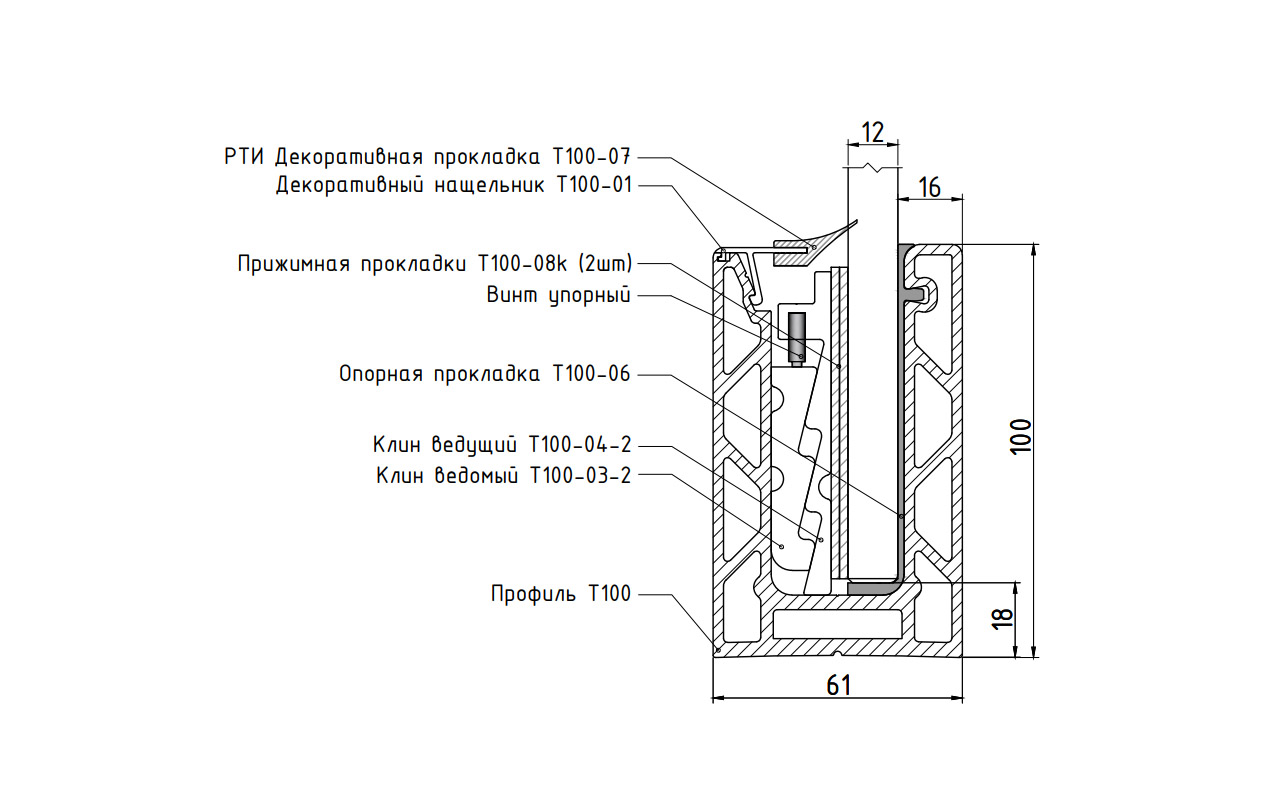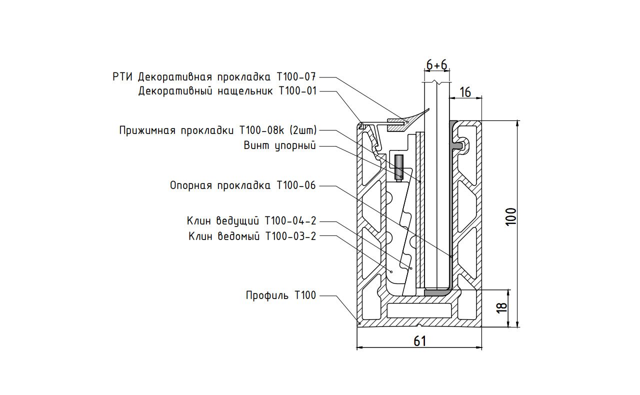Системы зажимных алюминиевых профилей т100 предназначены для 8 типов размеров зажимаемых закаленных стекол: 10мм, 12мм, 16мм, 20мм, а также триплекса 5+5мм, 6+6мм, 8+8мм, 10+10мм