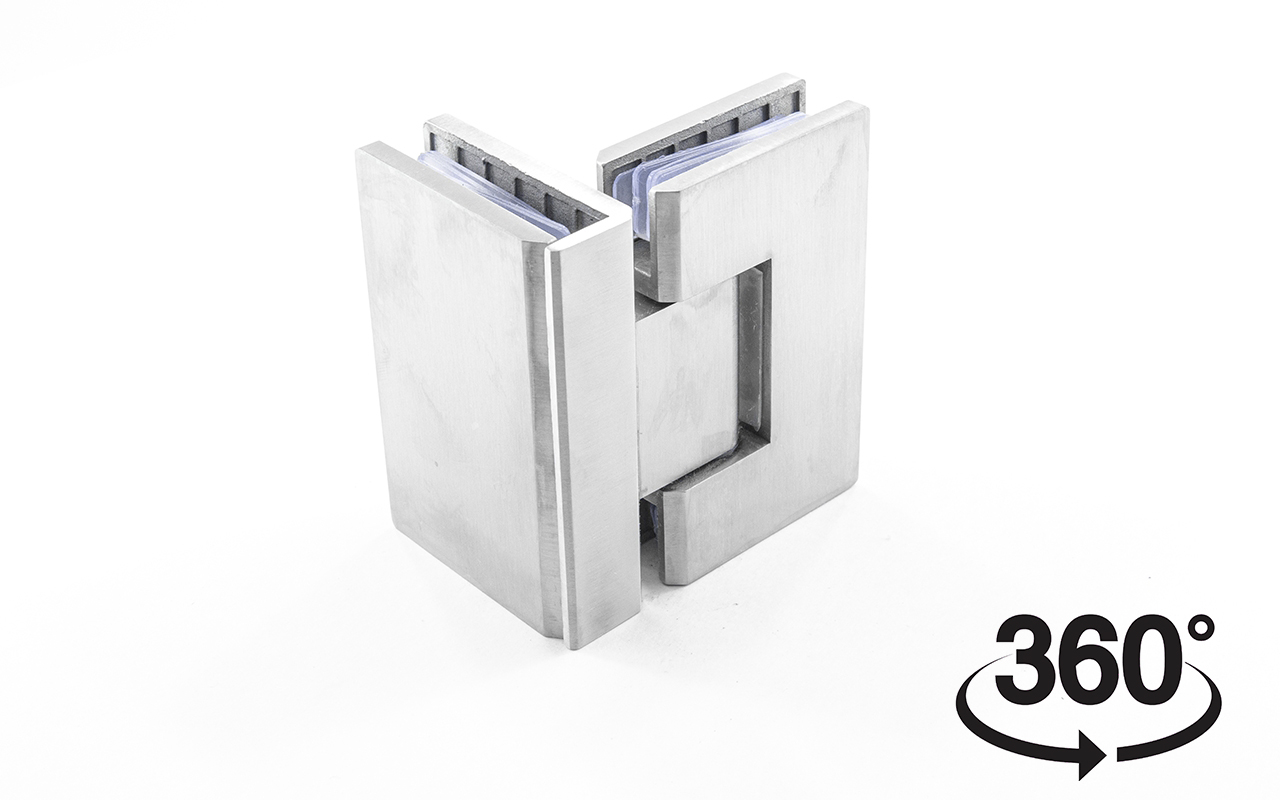 Материалы из нержавеющей стали отличаются надежностью стыковки стеклянных полотен, а также высокой стойкостью к коррозии. Именно последнее качество лежит в основе долговечной эксплуатации. Представленный здесь вид петель имеет конфигурацию стекло-стекло и позволяет закрывать двери душевых кабин в диапазоне с 250 до 900. В них реализована функция доводчика, что делает их эксплуатацию эргономичной. Прокладка обеспечивает место стыковки двух полотен из стекла не только герметичностью, но и поглощением вибраций.