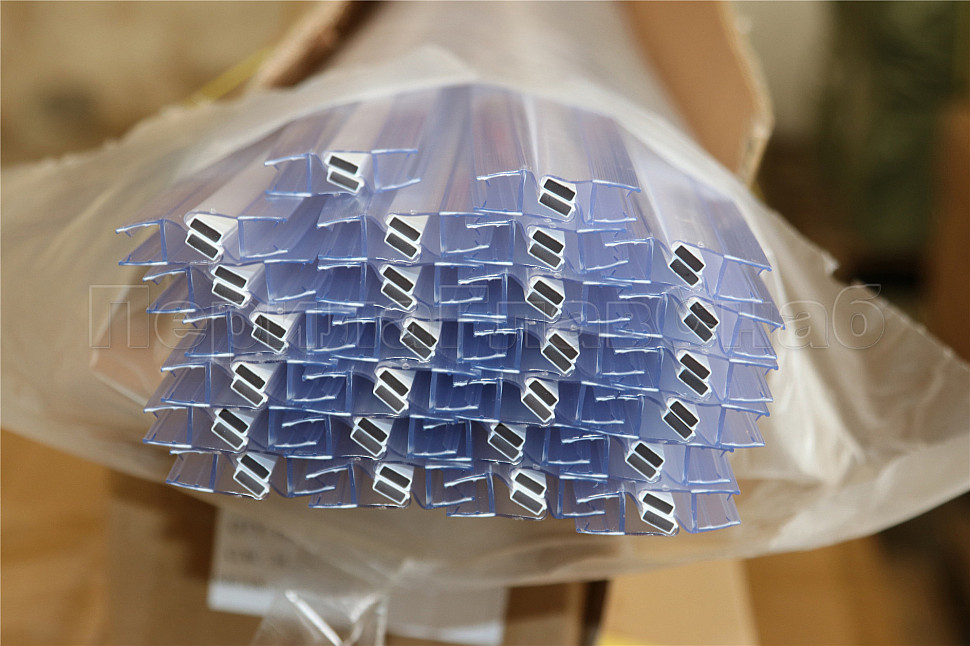 Комплект из двух профилей с магнитом. Монтируется по всему периметру стеклянного листа. Позволяет герметично соединять стеклянные панели между собой благодаря встроенному магниту. Толщина одного типоразмера составляет 1.5 мм, длина – 2200 мм. За счет своих свойств (стойкость к щелочам, минеральным маслам и многим кислотам) прекрасно подходит для крепления стеклянного листа по всему периметру. Применение этого комплекта гарантирует отсутствие течи в вертикальной части конструкции. Уплотнитель из комплекта применим в сочетании со стеклом толщиной до 8 мм и углом в плане до 90 и 180.
