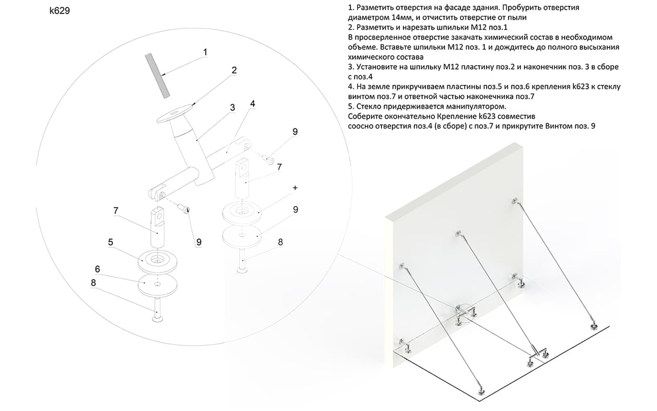 Имеет два стеклодержателя и одну точку крепления к стене.
