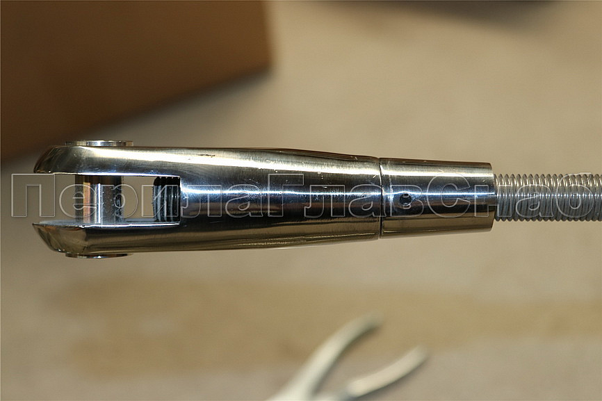Наконечник монтируется на тягу, затем концом с пазом крепится на серьге либо на крепление со стеной.