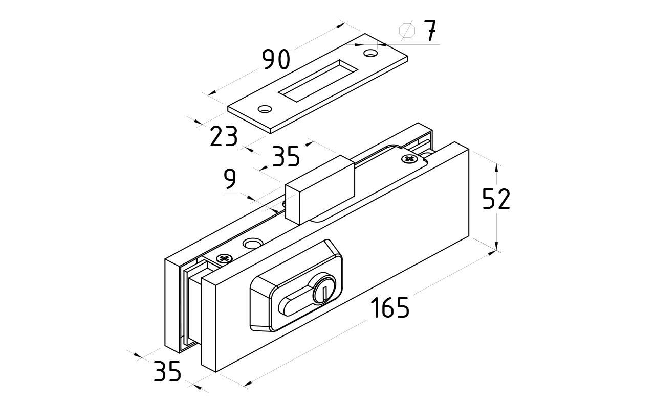 Сбоку нажимаем на крепления крышек и снимаем. Отвинчиваем винты, и фиксируем замок в подготовленный вырез в стекле. Далее закручиваем и фиксируем обратно крышки. Ответную часть крепим под замком с пробуренным отверстием под ригель.