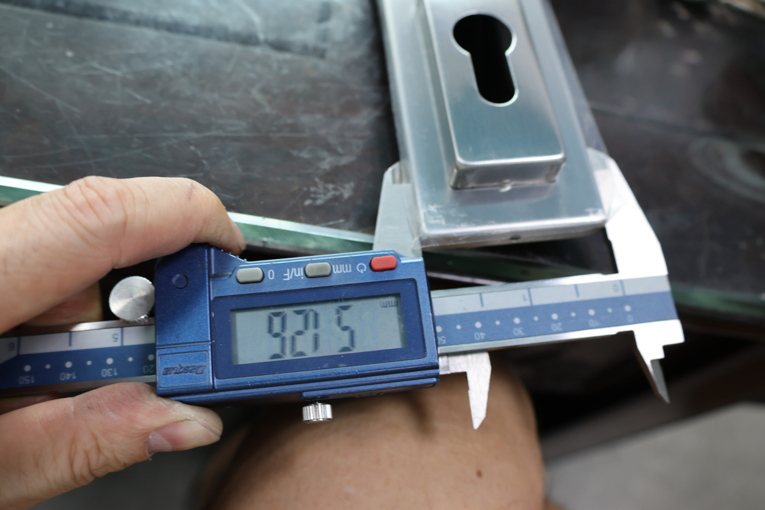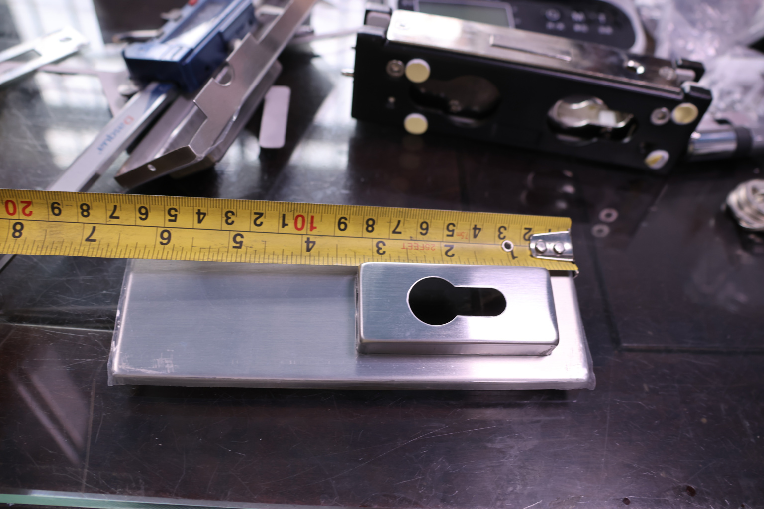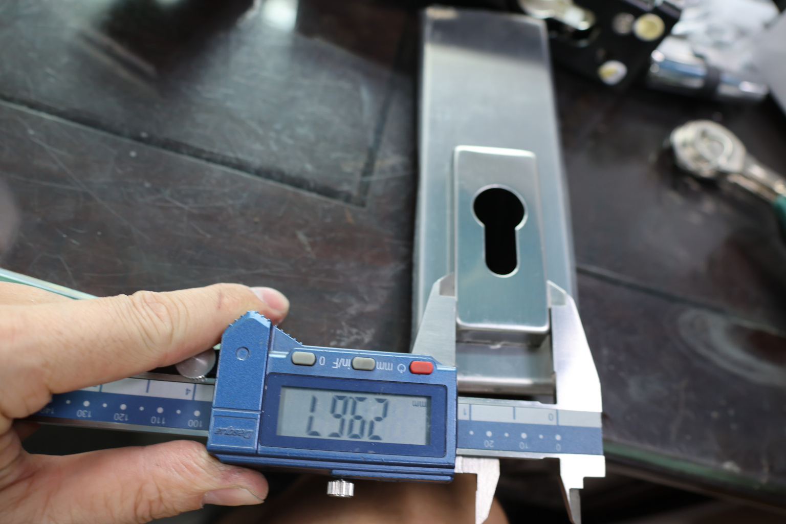 Замок для стеклянной двери центральный с прямоугольным ригелем, шлифованный, вырез 13