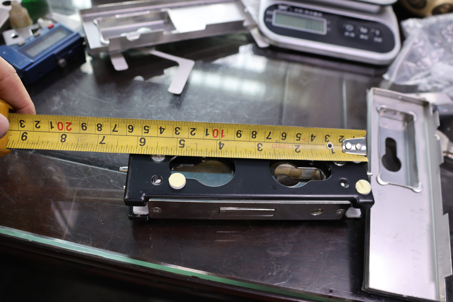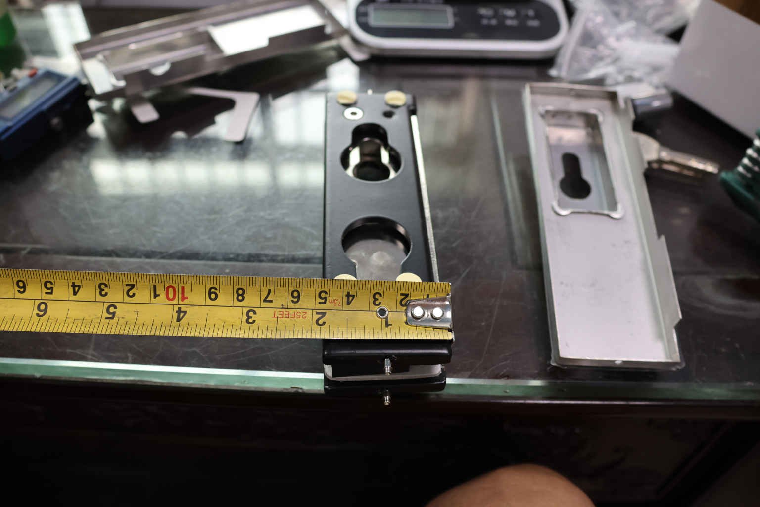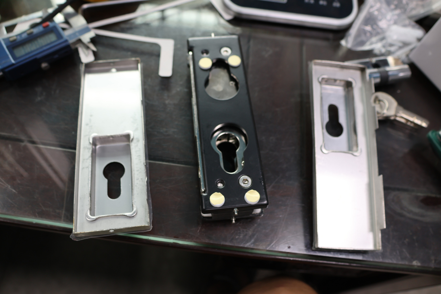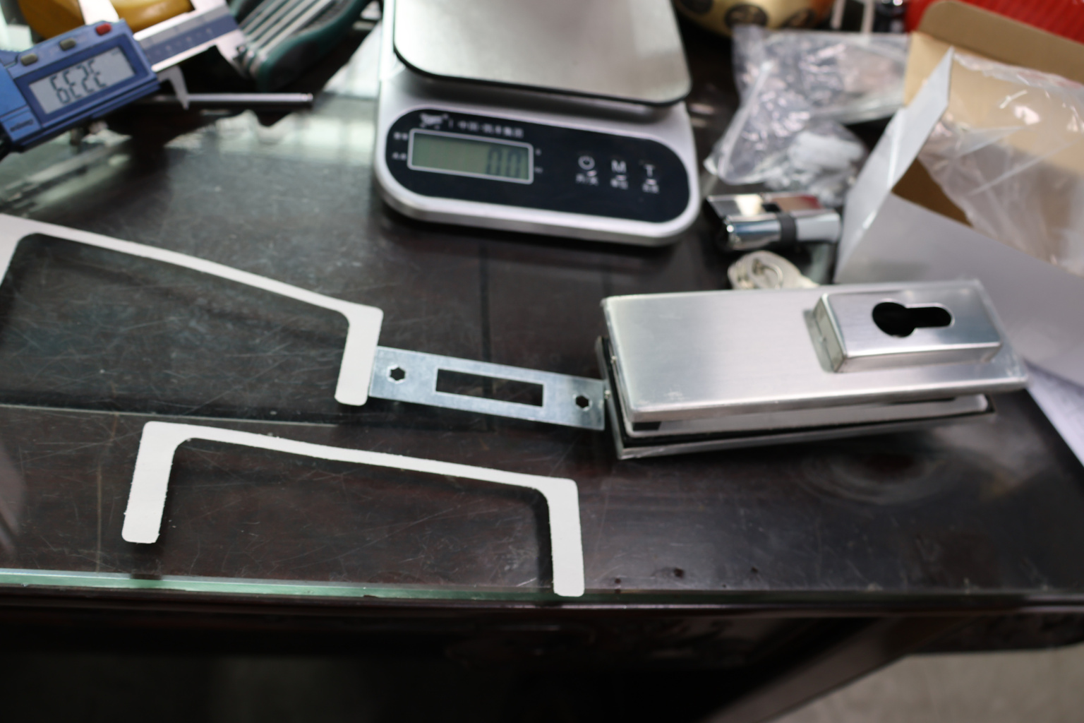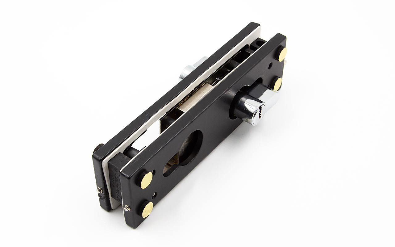 Сбоку нажимаем на крепления крышек и снимаем. Отвинчиваем винты, и фиксируем замок в подготовленный вырез в стекле. Далее закручиваем и фиксируем обратно крышки. Ответную часть крепим под замком с пробуренным отверстием под ригель.