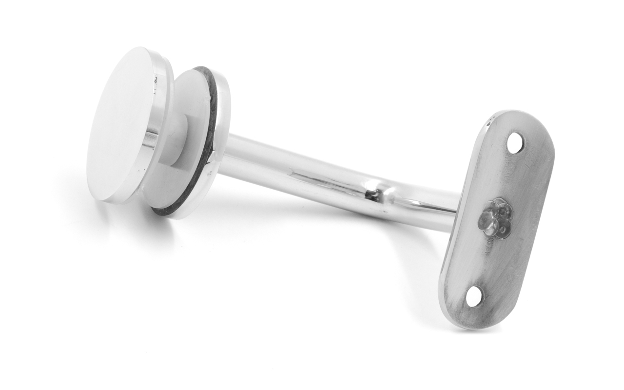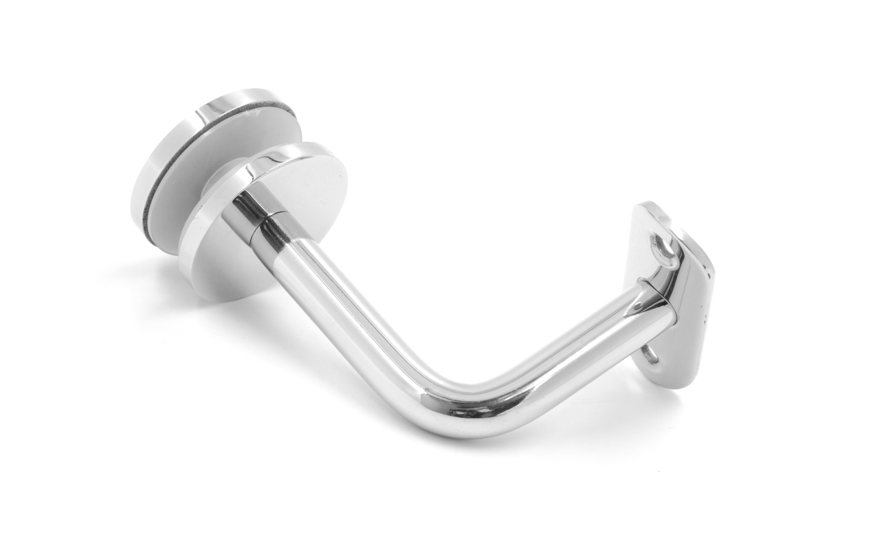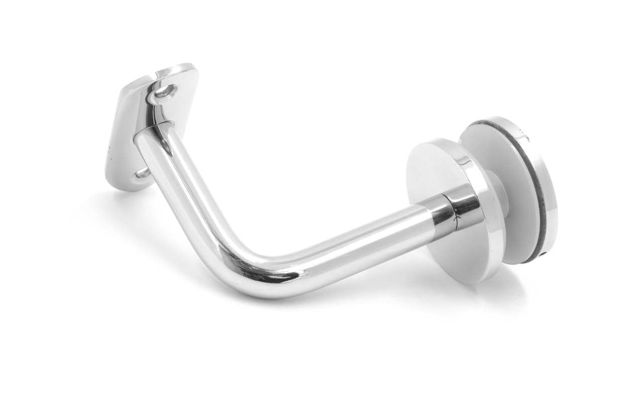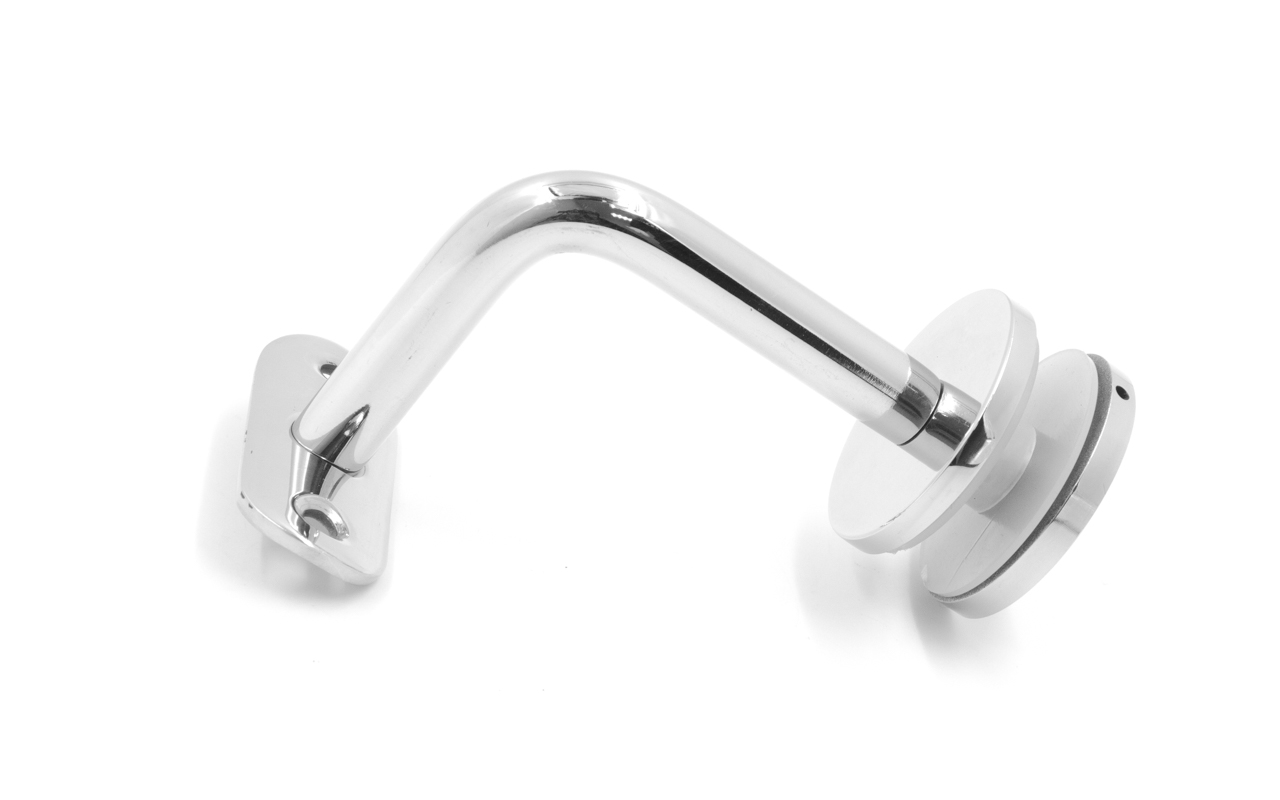 Для установки бокового держателя в стекле сверлится отверстие диаметром 17 мм, затем пристенок фиксируется затяжной гайкой в торце фланца. А сам поручень приваривается к загнутому наконечнику фитинга.