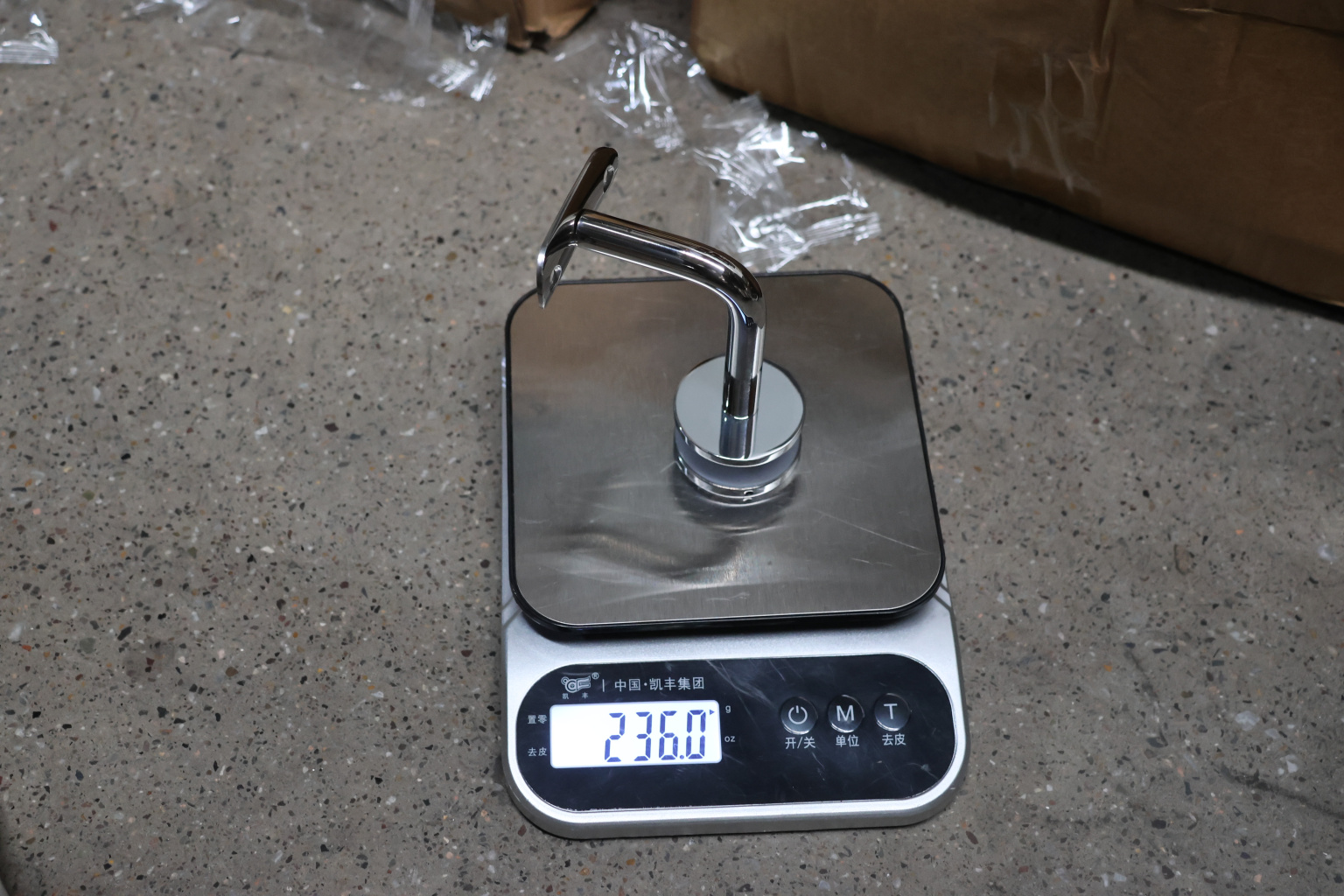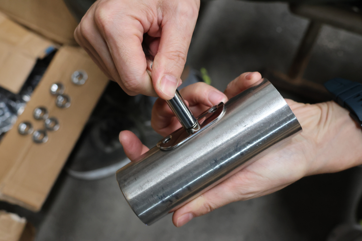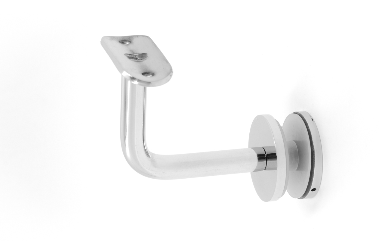 Для установки бокового держателя в стекле сверлится отверстие диаметром 17 мм, затем пристенок фиксируется затяжной гайкой в торце фланца. А сам поручень приваривается к загнутому наконечнику фитинга.