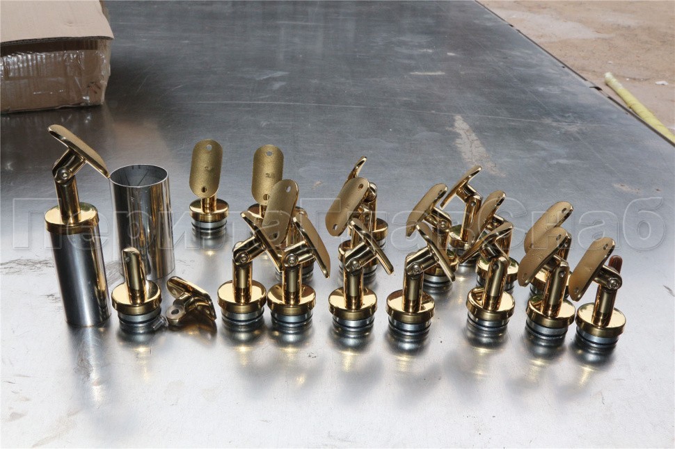 Покрытие нитрид титаном по внешнему виду не отличить от золота! Устойчиво к воздействию воды, не подвержено коррозии. При механическом воздействии проявляет себя лучше, чем простая нержавейка. Покрытие наносится на деталь из 304 марки стали. Ограждение, выполненное под этот драгоценный металл не может не привлекает внимание! Смотрится богато и изящно, придавая дополнительную ценность всему ограждению в целом.