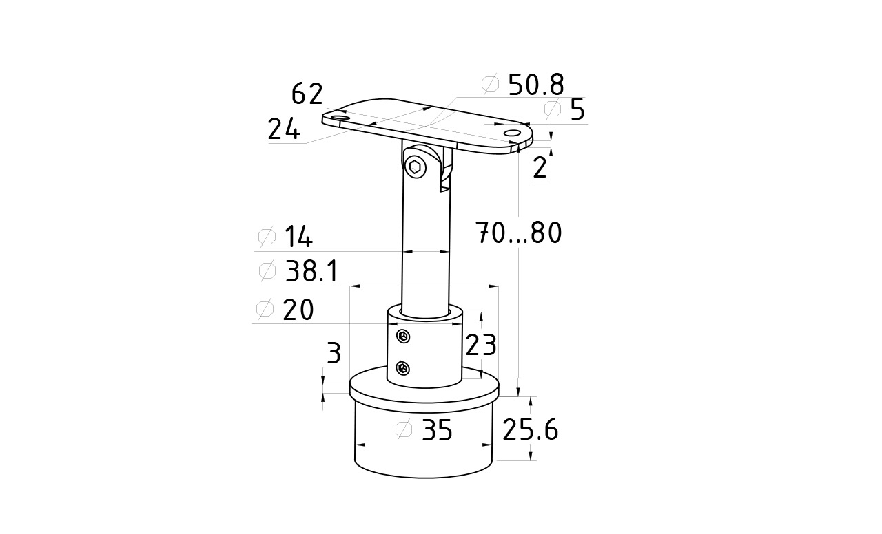 Наконечник регулируемый по высоте на стойку Ø38.1х1.5 мм, с регулируемым ложементом под поручень Ø50.8 мм. Наконечник литой, полированный, нержавеющий. Марка стали - AISI 304