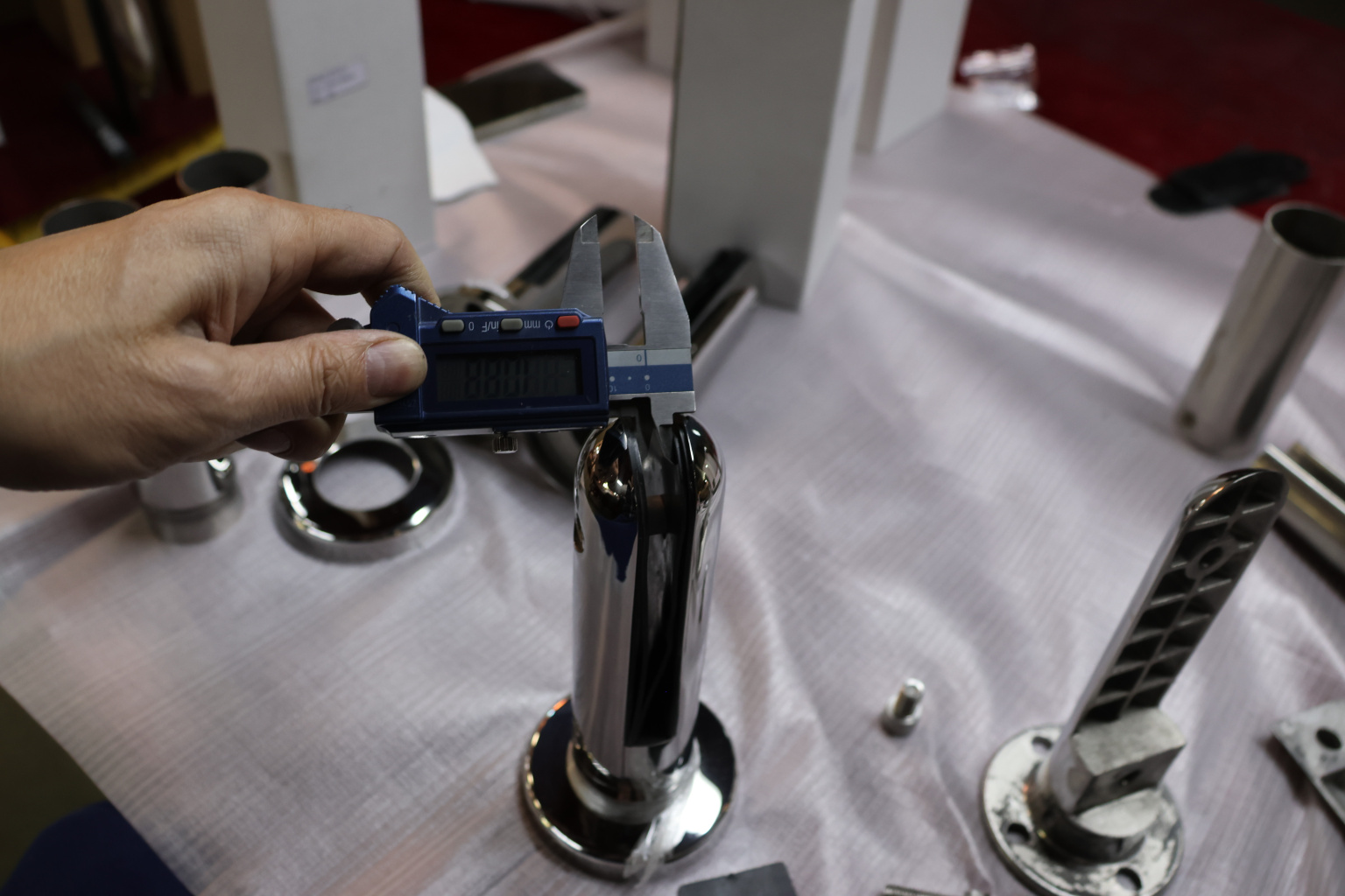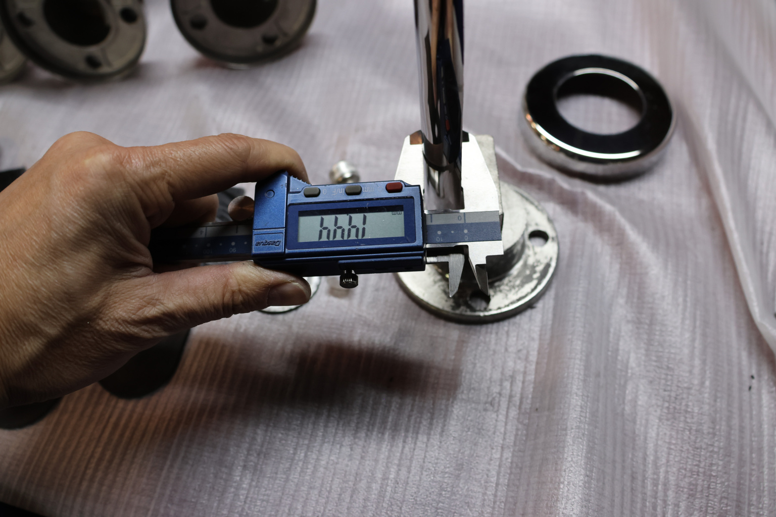 Стеклодержатель Ø50х10х18, шпилька М16х205 мм, для стекла 8-40 мм, AISI (201), с возможностью регулировки выноса до 65 мм, для торцевого крепления стекла, полированный, литой k277-3 купить в Челябинске