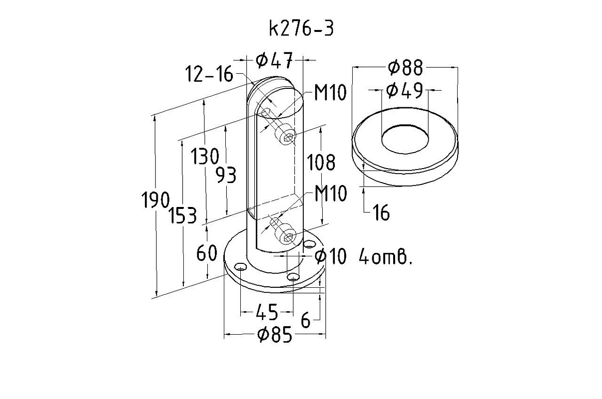 Стеклодержатель литой напольный, круглый, для стекла 12-16 мм, полированный (AISI 304) k176-2