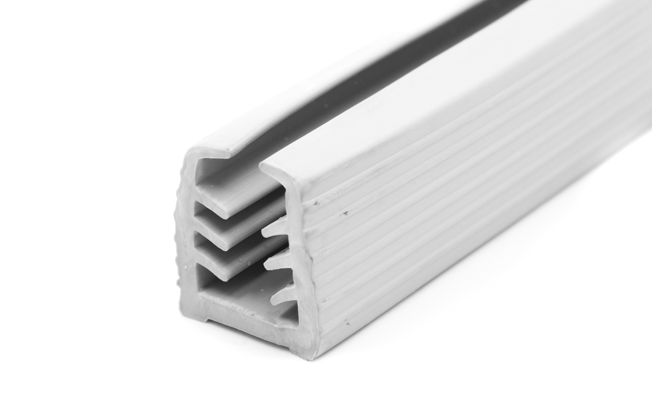 Уплотнитель изготовлен из специального EPDM (Этилен-пропиленовый каучук). Он имеет превосходную термо- и износостойкость, также устойчив в агрессивных средах, обладают хорошими диэлектрическими свойствами. При эксплуатации поручень с таким уплотнителем не болтается и жёстко сидит на стекле. Не рекомендуется хранение в холоде