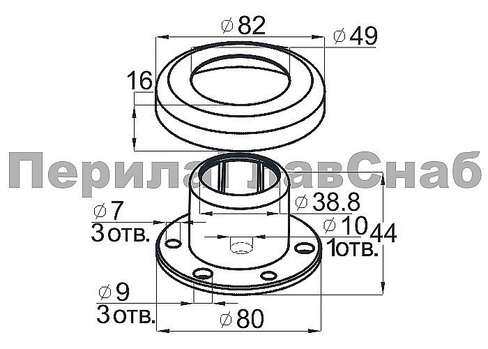 Фланец стойки 42.4/80 х 5 (4,3) х AISI 304 #200 3 отв х М10 х 20 k116-42-4 купить в Челябинске