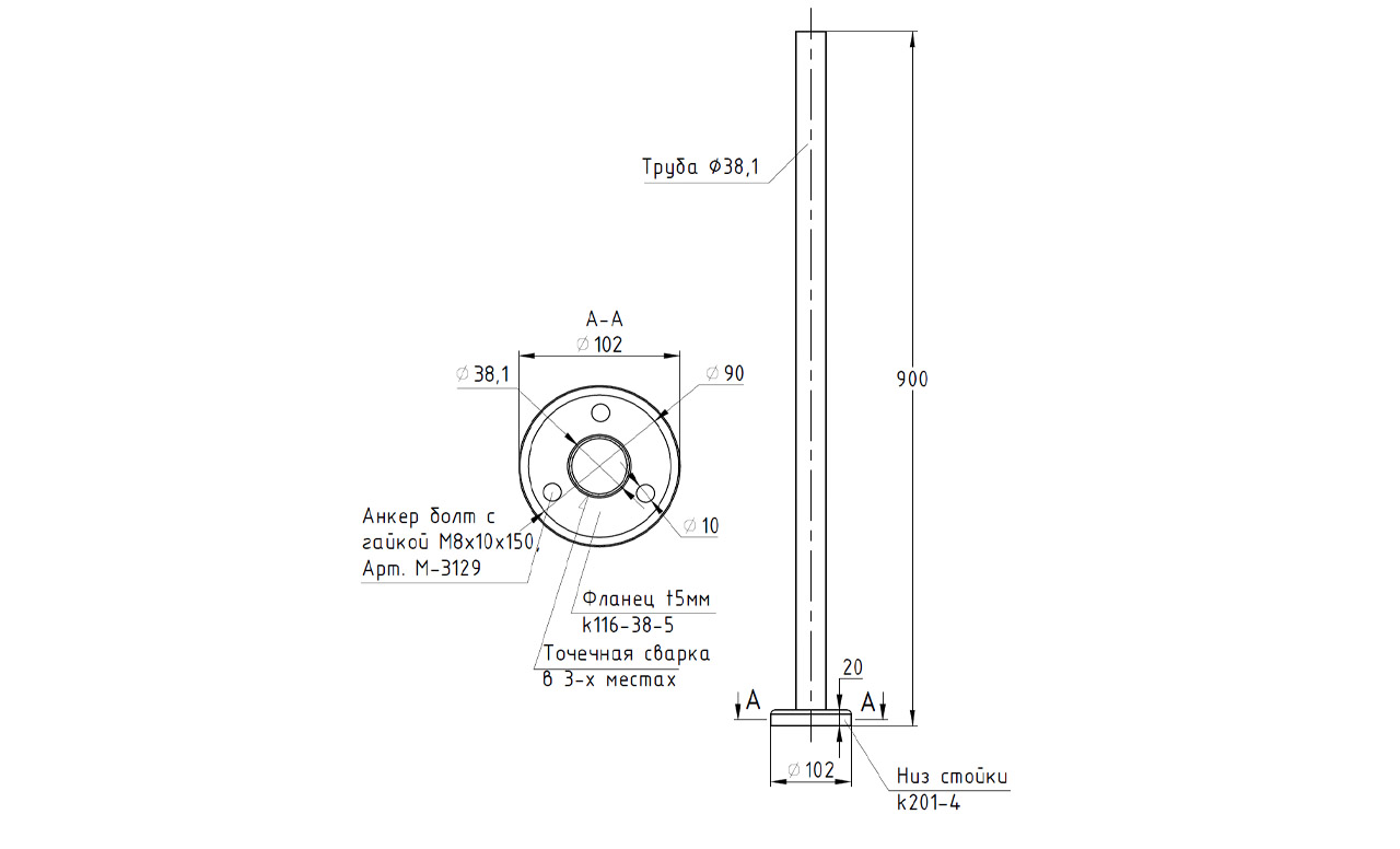 Готовая стойка Ø38,1мм, с фланцем, высота 900мм, полированная (aisi 304)