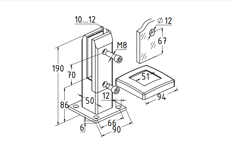 Держатель крепится в пол на 4 анкера или шпильки. Для этого предусмотрено 4 отверстия диаметром 10-12 мм. Стекло просто зажимается в стеклодержатели с помощью двух фиксирующих винтов. Высота ограждения должна быть не более 1200 мм от пола. Если по проекту предусмотрен поручень, то мы рекомендуем использовать трубу с пазом прямоугольного сечения 60х40 (k824-4, k824-2, k824-5 ) или круглого сечения Ø48.3 мм ( k822-3) и Ø42.4 мм (k820-3