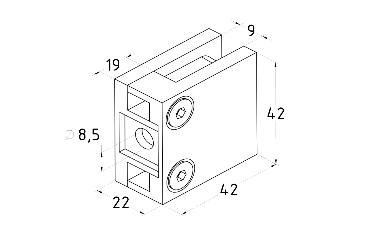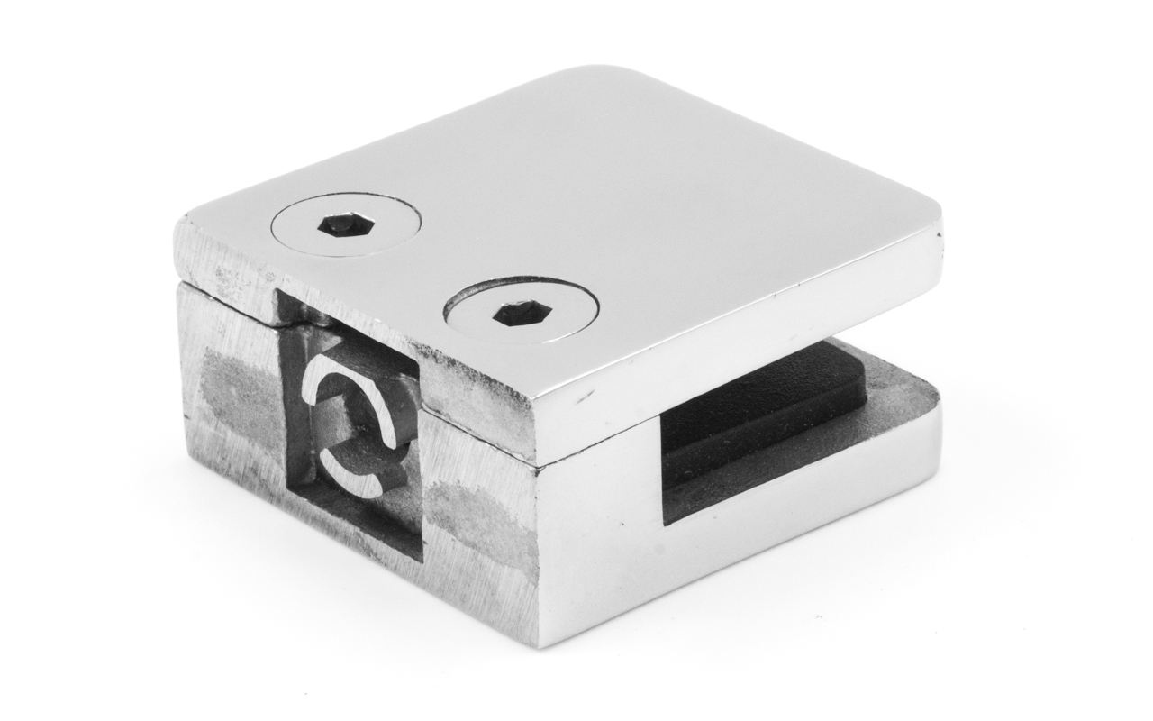 Стеклодержатель литой, под стекло 8 мм. 4+4 мм. на плоскость 42х22,5х42 полированный (AISI 304) k003