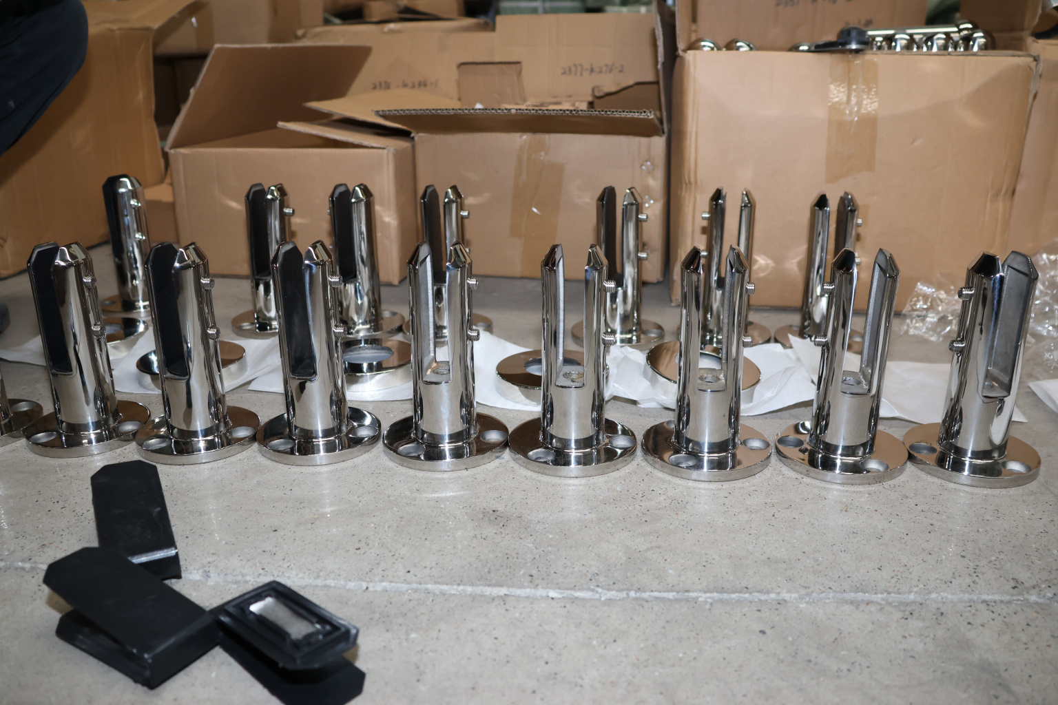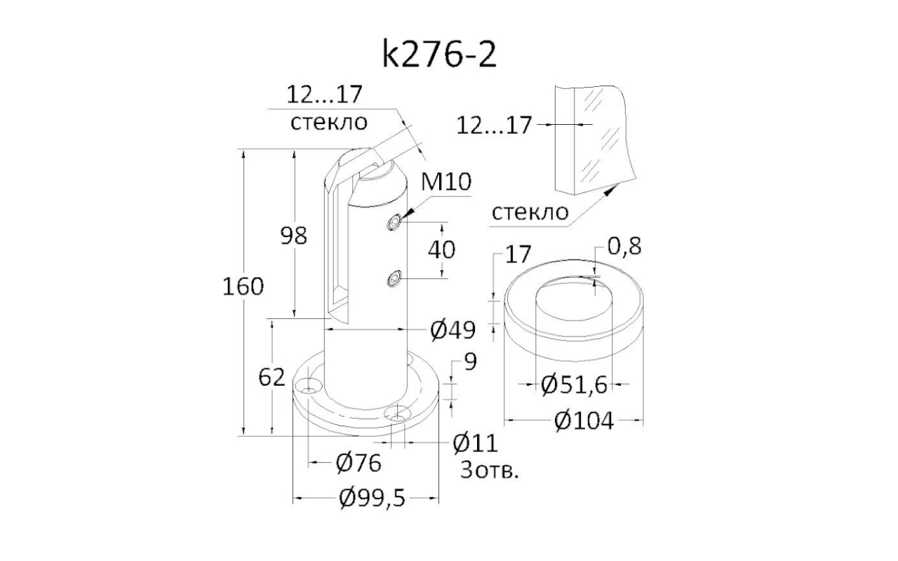 Держатель крепится в пол на 3 анкера или шпильки. Для этого предусмотрено 3 отверстия под шпильку диаметром 10 мм. Стекло просто зажимается в стеклодержатели с помощью двух фиксирующих винтов. Высота ограждения должна быть не более 1200 мм от пола.