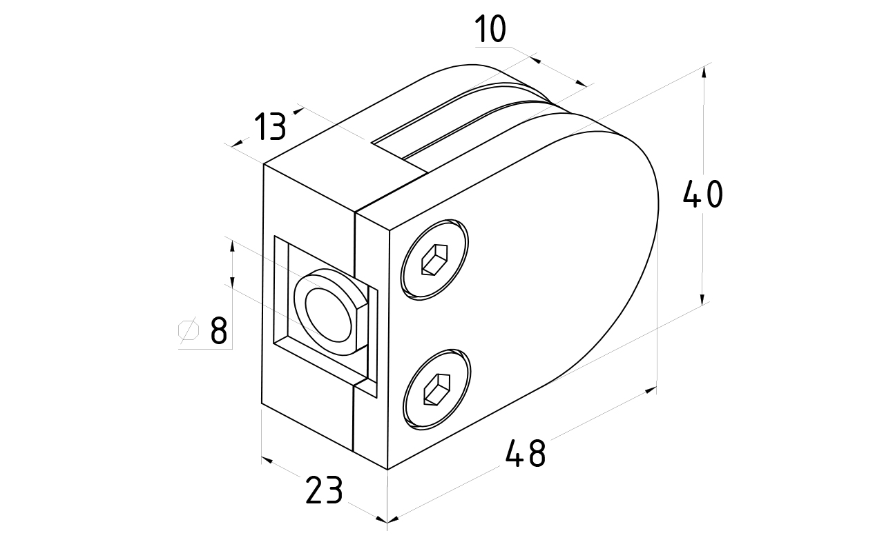 Стеклодержатель литой, под стекло 8 мм. 4+4 мм. на плоскость 40х22х48 полированный (AISI 304) k002-2