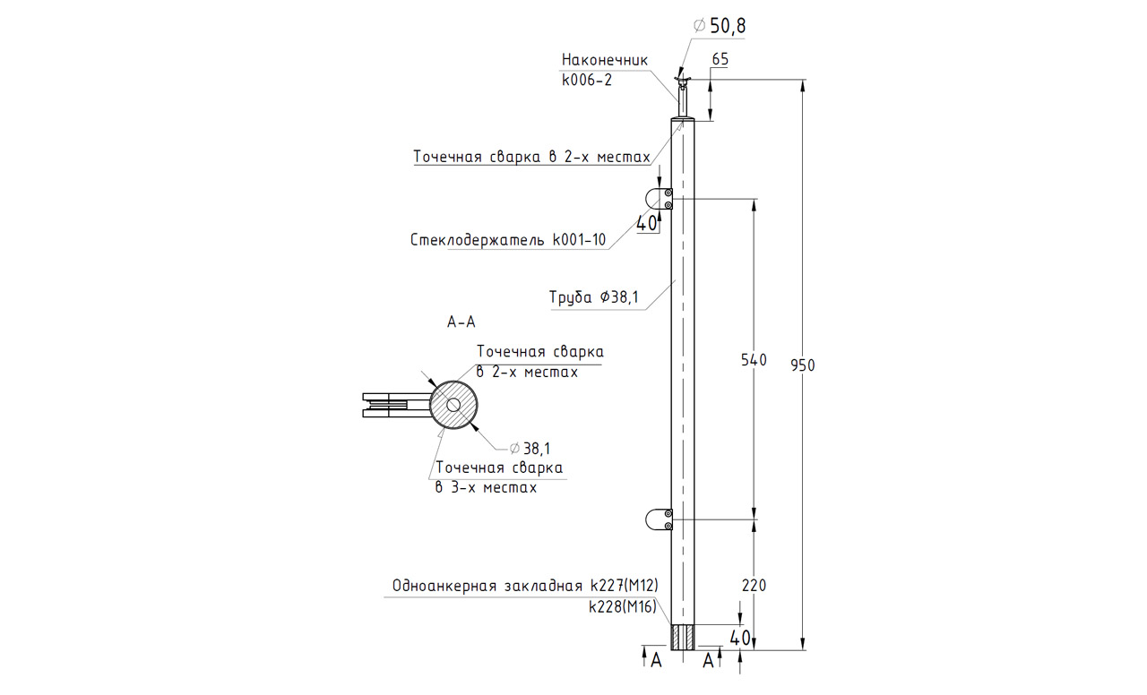 Готовая стойка Ø38,1 мм, с одноанкерным крепежом М12, высота 900 мм, полированная (AISI 304) k735