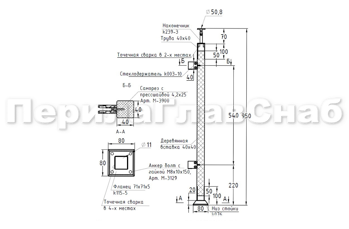 Готовая стойка 40х40х950 мм, деревянная, со вставками из нержавеющей стали 2х100 мм с 3 ригеледержателями k740-1-G купить в Челябинске