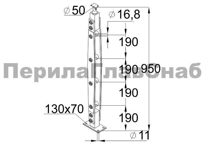 Стойка квадратная 40х40: 4 литых стеклодержателя, полированная, высота 950 мм (AISI 304) k746 купить в Челябинске