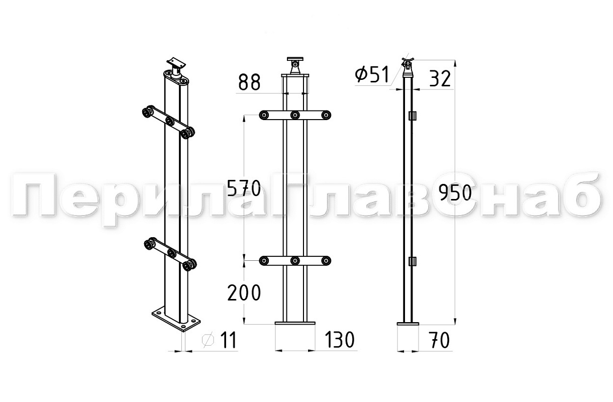 Стойка квадратная 40х40: 4 литых стеклодержателя, шлифованная, высота 950 мм AISI 304 k746-7 купить в Челябинске