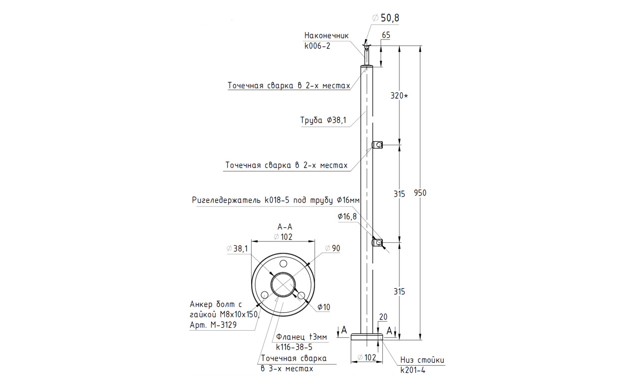 Низ стойки Ø38.1 мм, 102х18х0.6, полированный (AISI 304) k201-4 купить в Челябинске