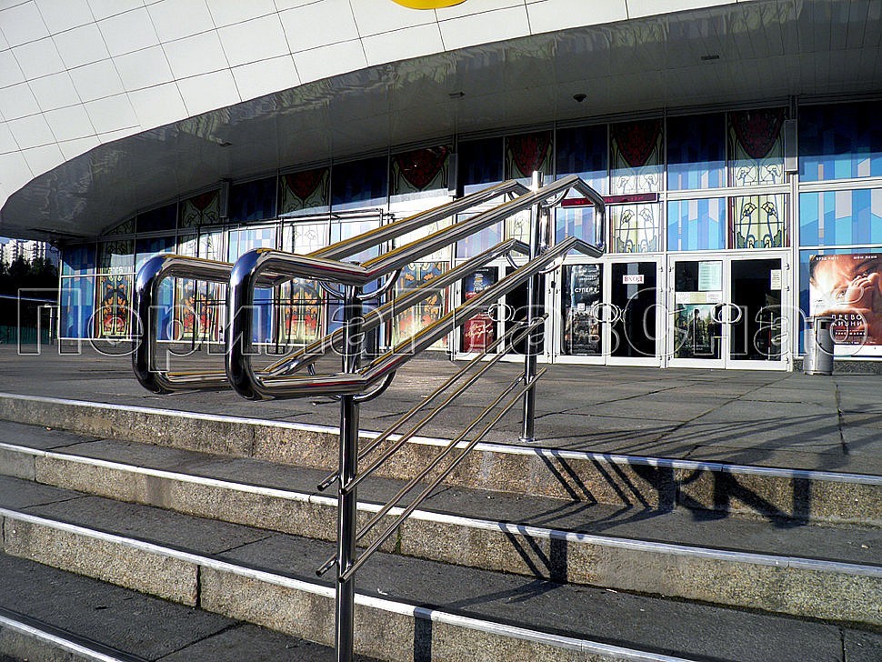У входа в киноклуб была установлена каскадная система потокоразделителей с двумя поручнями из нержавеющей стали, а также ограждение пандуса для инвалидов с выходом на горизонт уровня парковки на территории клуба.