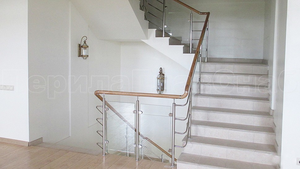Клееный дубовый поручень, без тонировки покрытый лаком в один слой крепится над стойками. Окончание поручня заглушка из полированной нержавеющей стали. Поручень крепится к держателю поручня на саморезах с полукруглой головкой. Поручень завязан между маршами дубовыми отводами через нержавеющие кольца с круглыми проставками из дуба. Между маршами (на повороте 90 градусов) внахлест на стойки привариваются снизу по четыре ригеля – трубки из полированной нержавеющей стали с забивными заглушками.