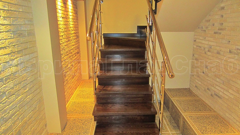 В загородный дом, было установлено лестничное ограждение высотой 950 мм с бронзовым каленым стеклом толщиной 8 мм и стойками из нержавеющей стали.