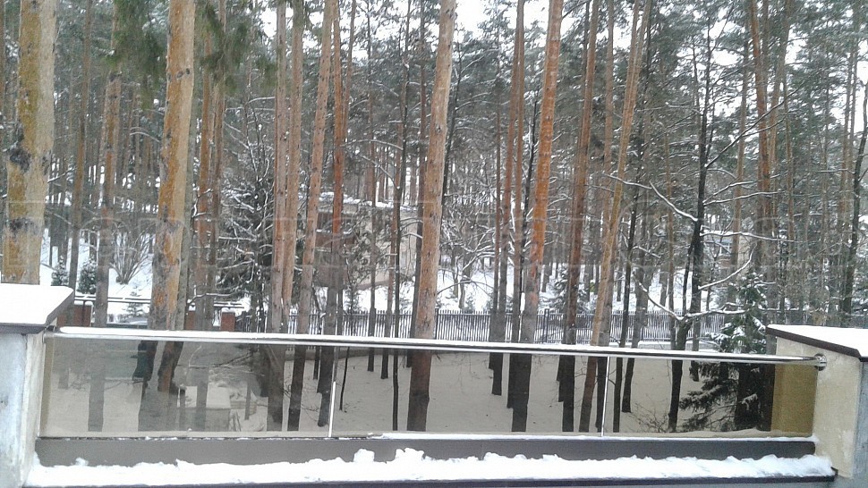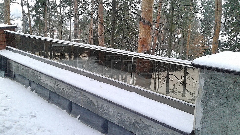 Было произведено ограждение кровли и полированной нержавеющей стали марки AISI304, высотой 600мм от уровня парапета, с установкой на парапет через проставки с каленым стеклом триплекс. Устанавливается в алюминиевый профиль цветом шоколадная бронза, сам профиль крепится в парапет на анкера. Сверху на стекло крепится поручень с пазом диаметром 42мм из нержавеющей стали марки AISI 304, поручень уходит в стену через фланец. Крепление между собой нержавеющих элементов ограждения произведено точечной аргонно-дуговой сваркой, длина швов 2мм, в последствие зачищены и отполированы. Данное ограждение отлично вписывается в интерьер здания, а качественная сталь не дает осечки даже в период холодов и повышенной влажности.