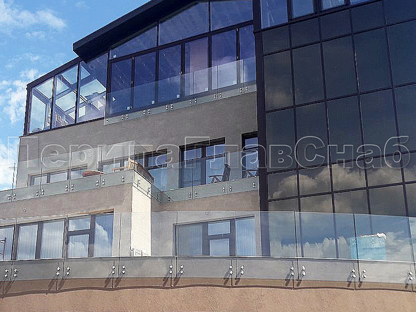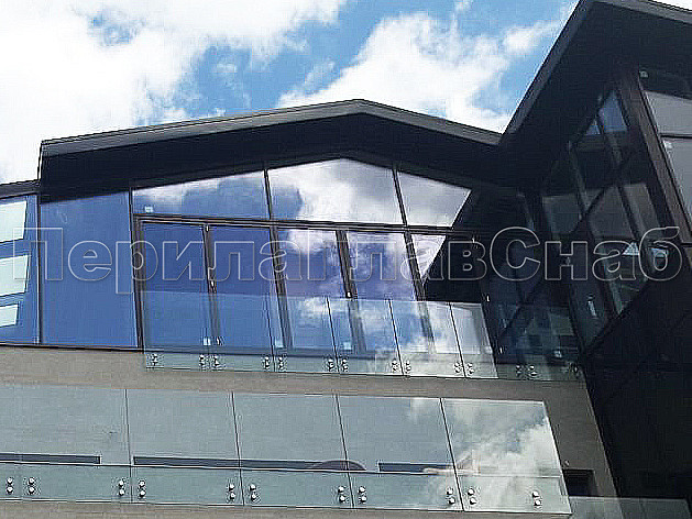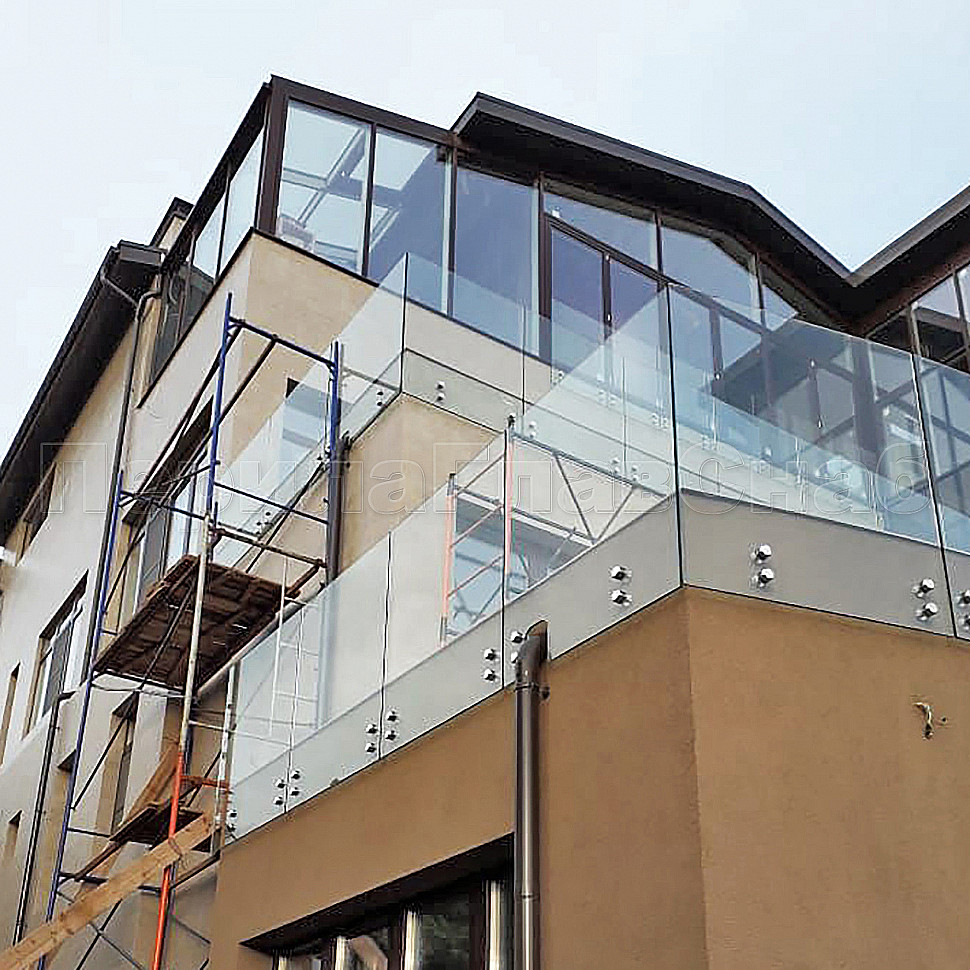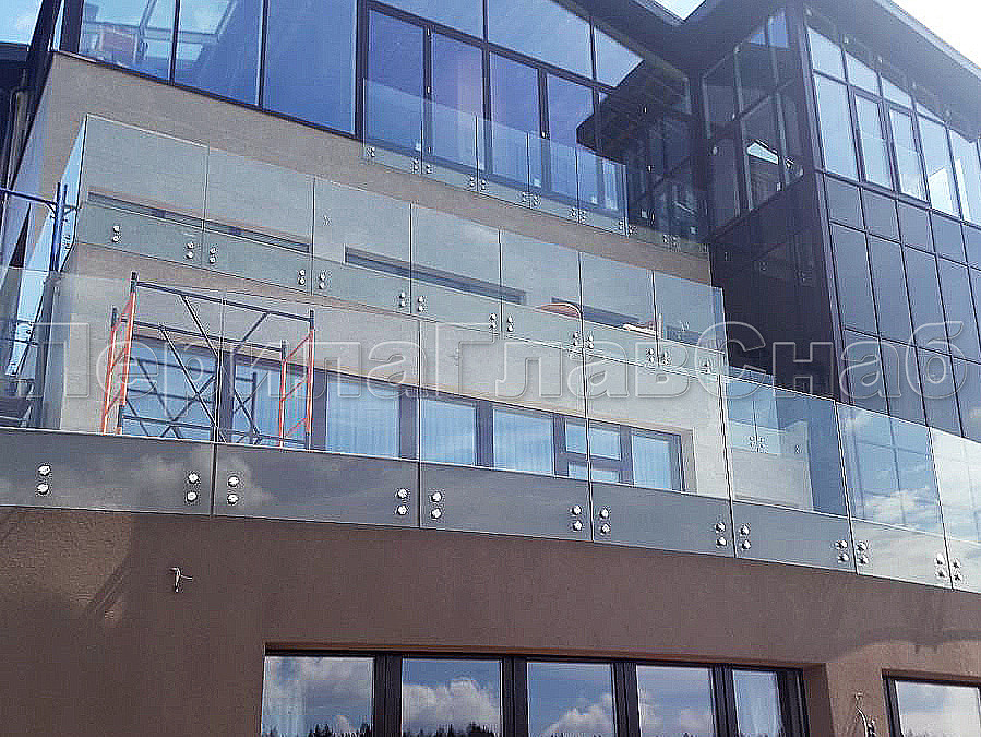 Конструктив : закаленное прозрачное стекло, толщиной 10 мм на точечном креплении.