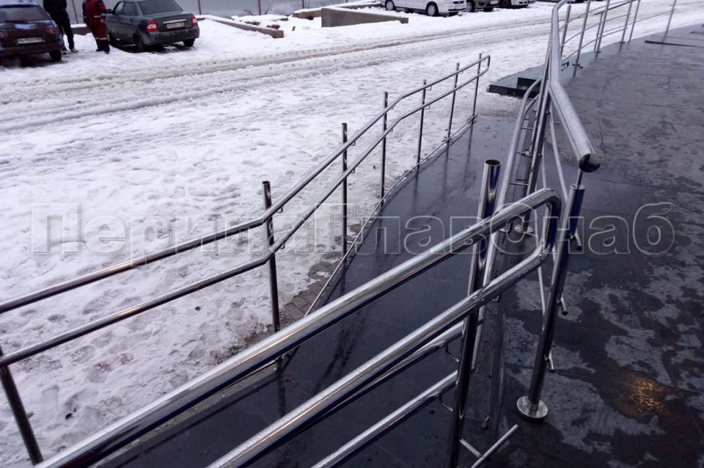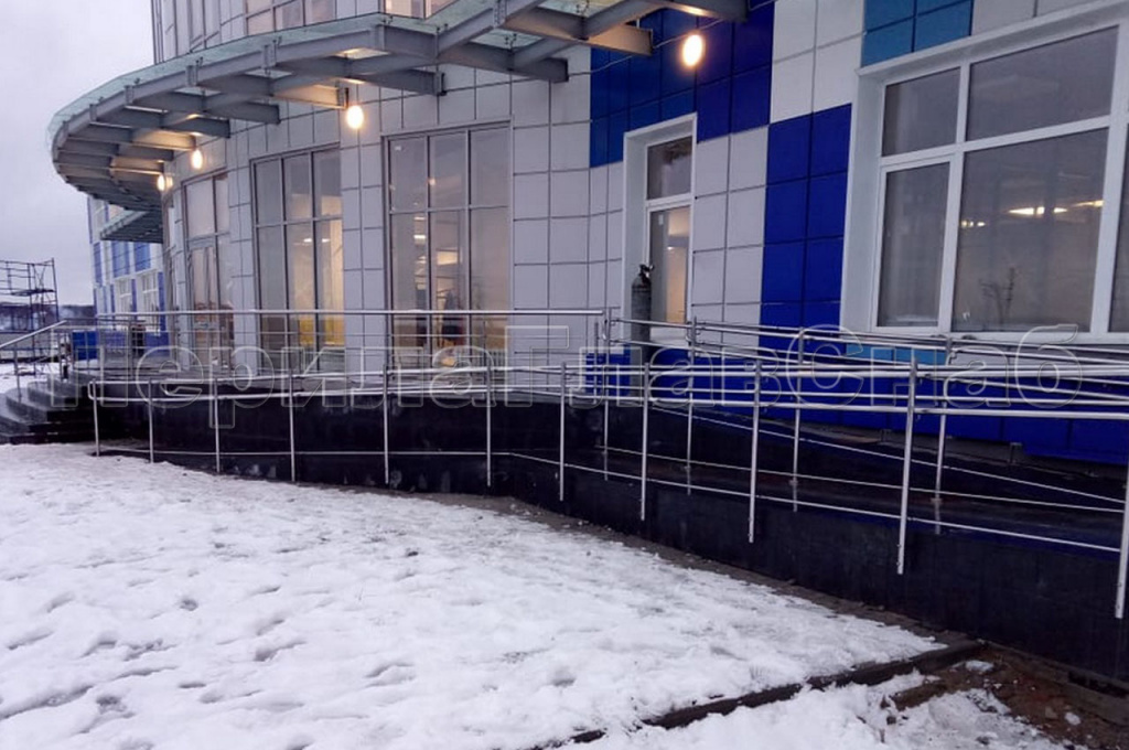 Зимой 2020 года мы установили ограждение входной группы и пандуса в поселке Першино, Владимирской области. Наш заказчик филиал НПО «Наука» должен отвечать самым высоким требованиям, как в своей продукции, так и в строительных мероприятиях. Именно поэтому они привлекли специалистов из компании «ПерилаГлавСнаб». Перед нами стояла задача изготовить и установить семьдесят восемь метров ограждения из полированной нержавеющей стали марки AISI 304. Самая большая сложность заключалась в том, что монтаж стоек нужно было производить в пол с электрическим отоплением покрытым керамогранитом. Для этого применили тепловизор, дабы попасть в те зоны, где не проходила проводка теплого пола. При монтаже использовалась зимняя химия, это обеспечило скорейшее застывание стоек ограждения в условиях зимы. В нескольких участках поручень и ригельное заполнение стоек прокатывалось по радиусу специальным трубогибом, что бы повторить контур самой входной группы. Как всегда, в работе были применены комплектующие собственного производства. Так же для данного проекта были разработаны и использованы удлиненные держатели поручня пандуса. Это было связано с толщиной вент фасада. Была необходимость жестко закрепить поручень в монолит здания пройдя фасад. Все эти мероприятия были применены, что бы отвечать требованиям ГОСТа по ширине пандуса между поручнями. Монтажные работы произведены в десятидневный срок, успешно сданы штатным прорабом прямо на объекте стороне заказчика. Стоимость метра погонного 7 950 руб.