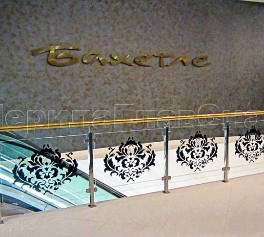 Ограждение лестницы со стеклом, тонированным в массе, стойки и завязки поручня из латуни