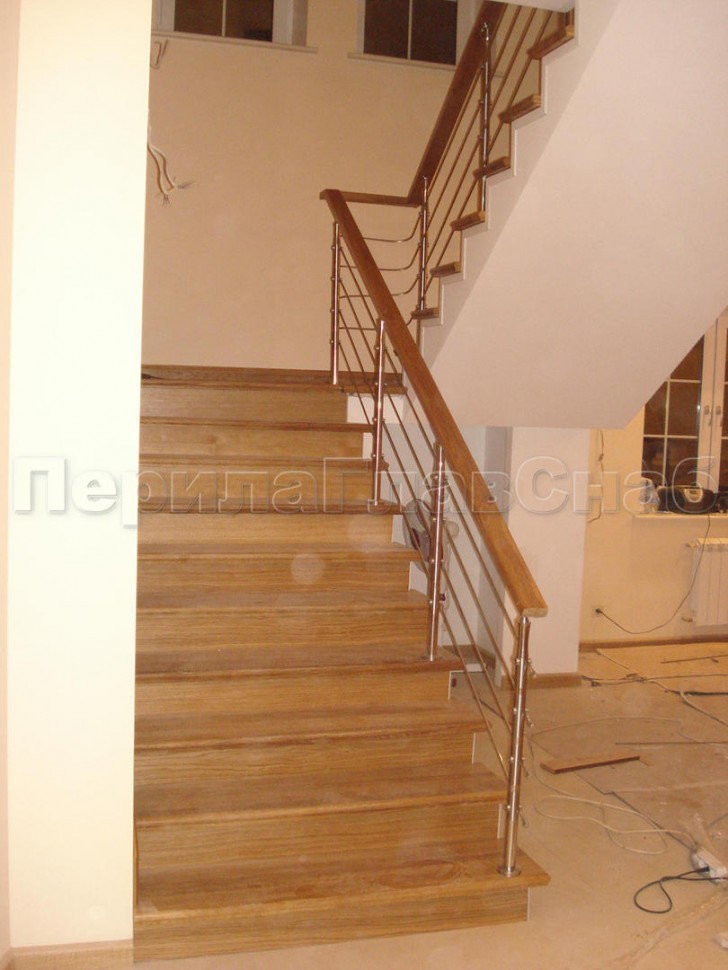Ограждения с двумя стойками в каждую ступень с деревянным поручнем и без ригелей