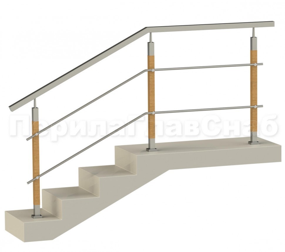 Четыре ригеля на держателях, квадратный деревянный поручень и квадратные стойки