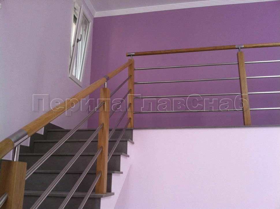 Три ригеля на сварке, квадратный деревянный поручень и круглые стойки