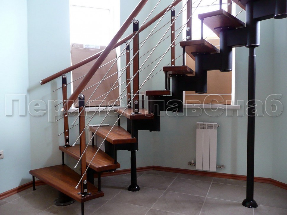 Три ригеля на сварке, квадратный деревянный поручень и круглые стойки