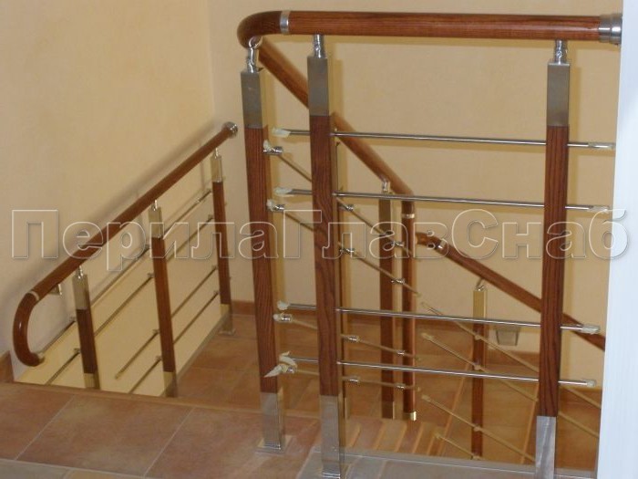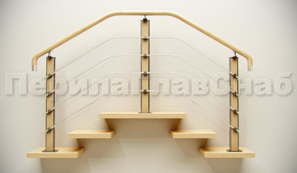 Четыре ригеля на держателях, квадратный деревянный поручень и стойки с деревянными вставками