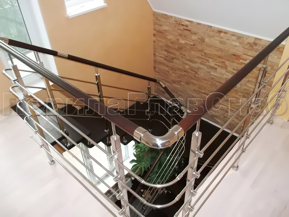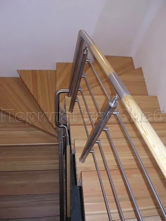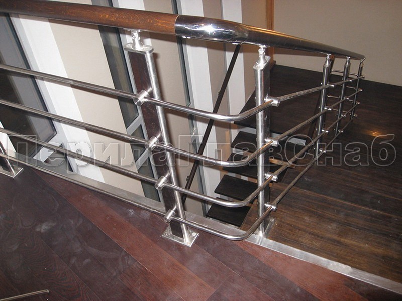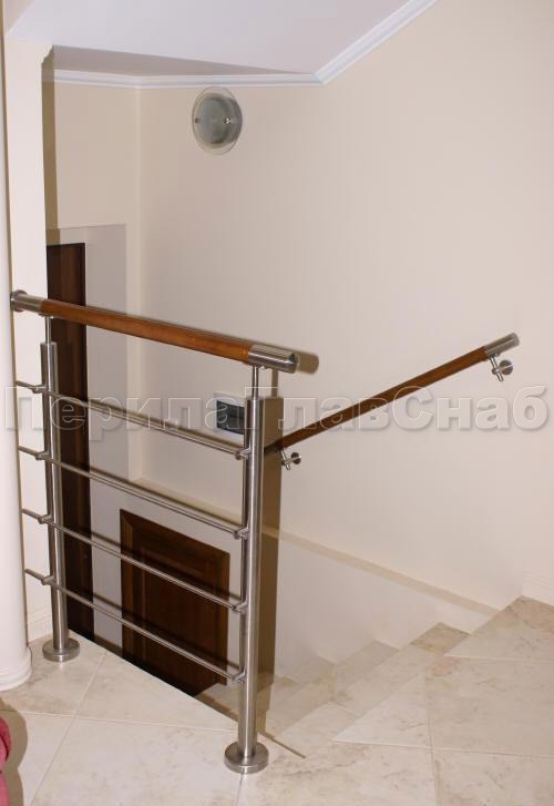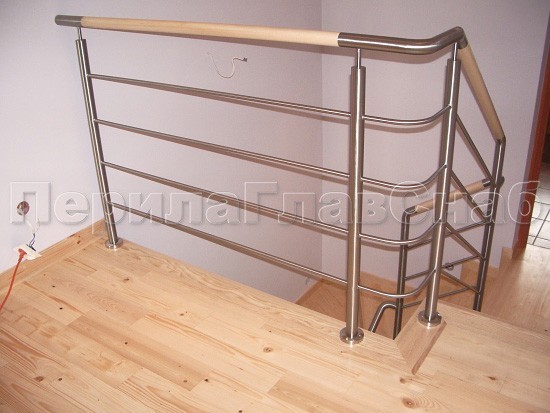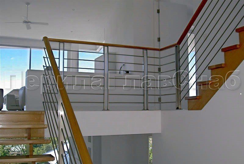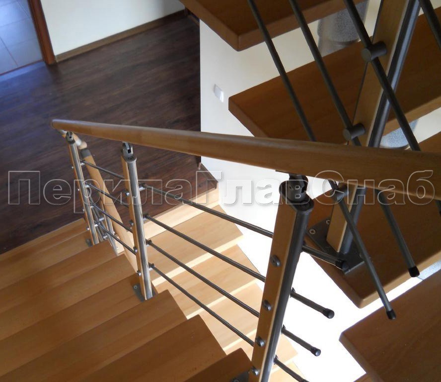 Записаться на встречу Четыре ригеля на держателях, круглый деревянный поручень и квадратные стойки