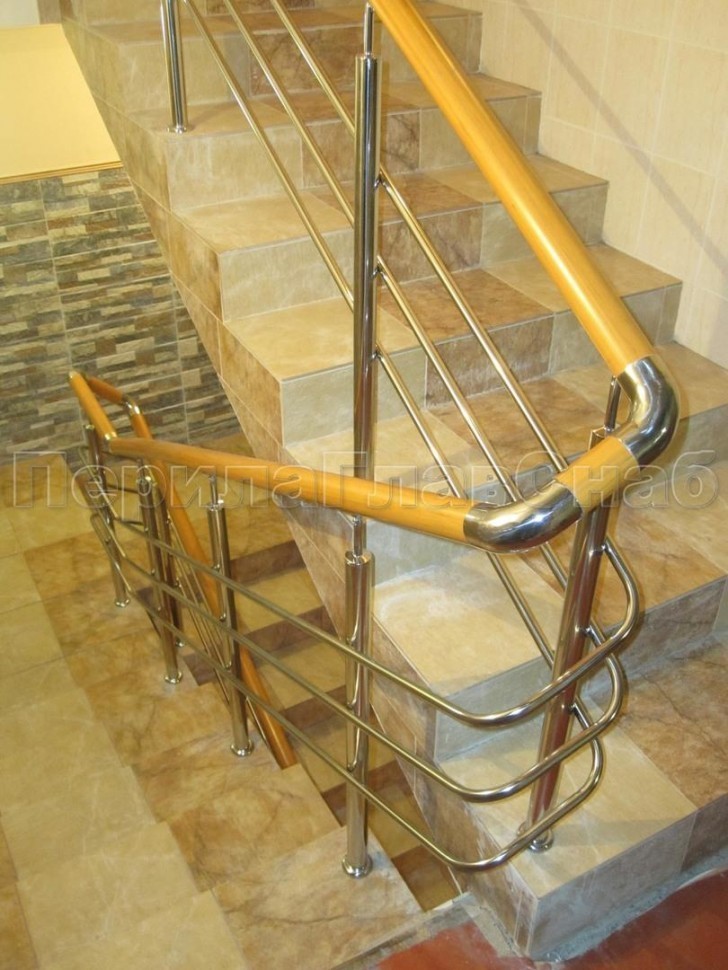 Нержавеющие ограждения без ригелей с круглым деревянным поручнем и стойками с деревянными вставками