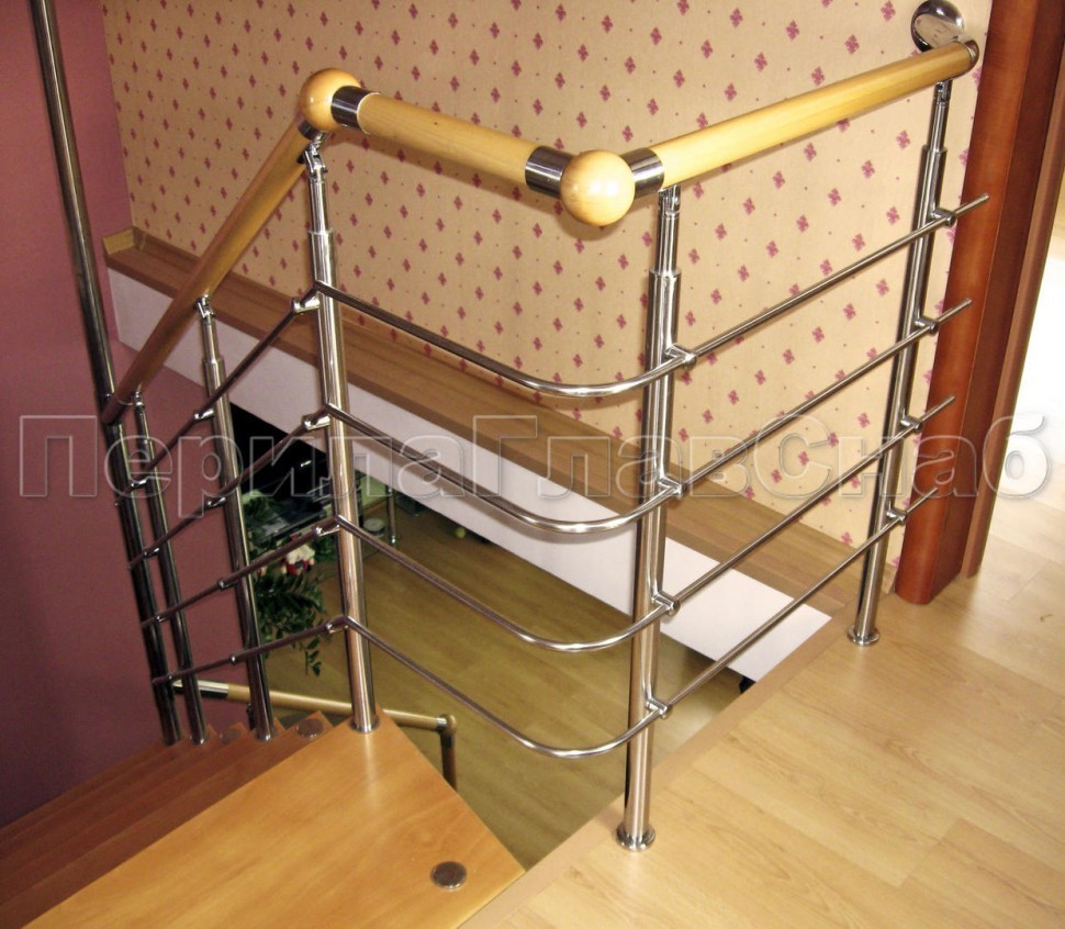 Три ригеля на сварке, квадратный деревянный поручень и круглые стойки