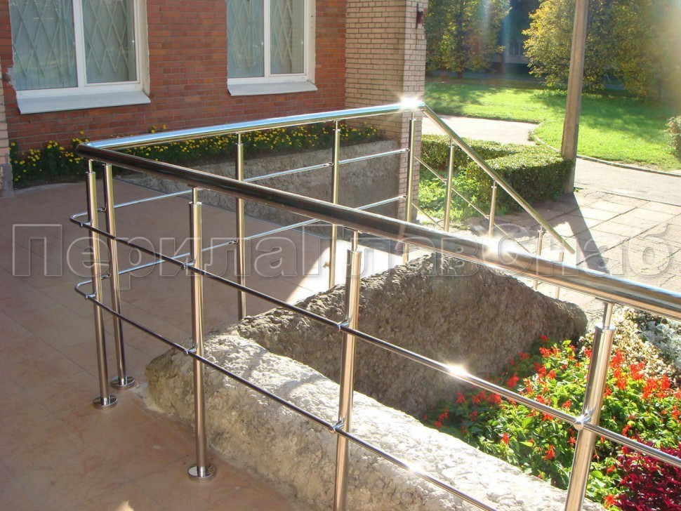 Четыре ригеля на сварке, круглый поручень и круглые стойки для крыльца