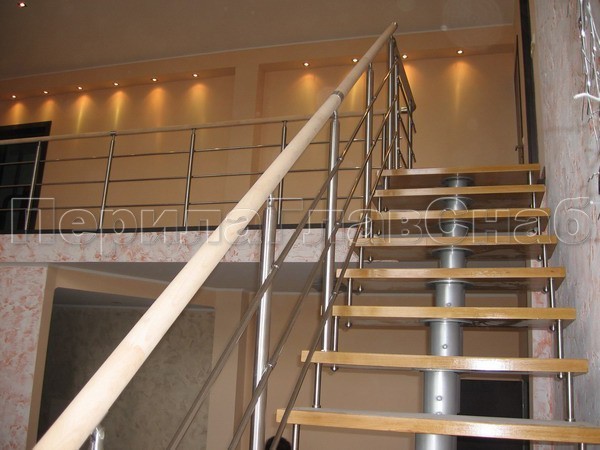 Ограждения с двумя стойками в каждую ступень с деревянным поручнем и без ригелей