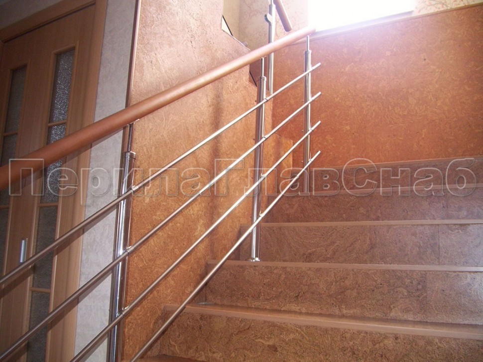 Три ригеля на сварке, квадратный деревянный поручень и круглые стойки