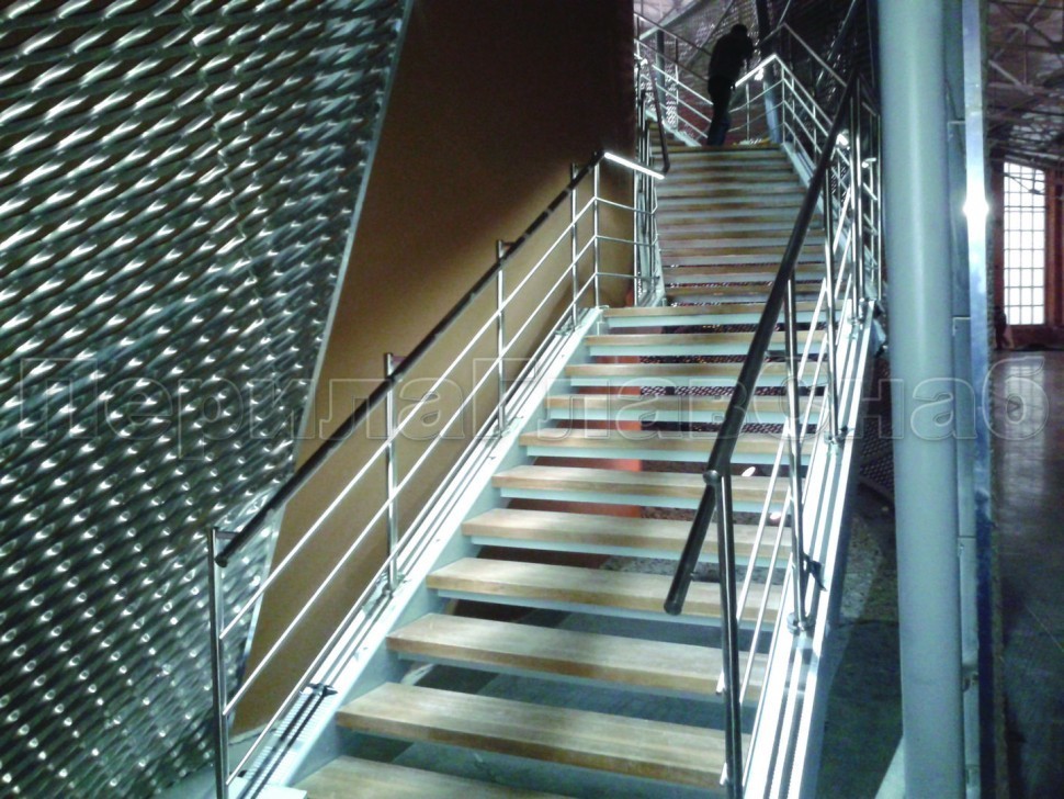 Ограждения с двумя стойками в каждую ступень с деревянным поручнем и без ригелей