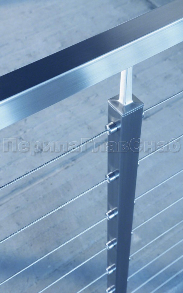 Ограждения из нержавейки. Заполнение из 4х тросиков. Квадратные стойки.