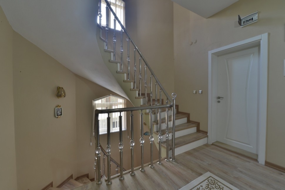 Ограждение лестницы со стеклом, тонированным в массе, стойки и завязки поручня из латуни