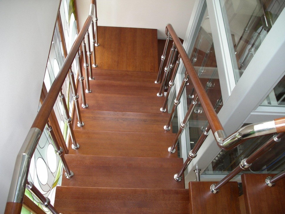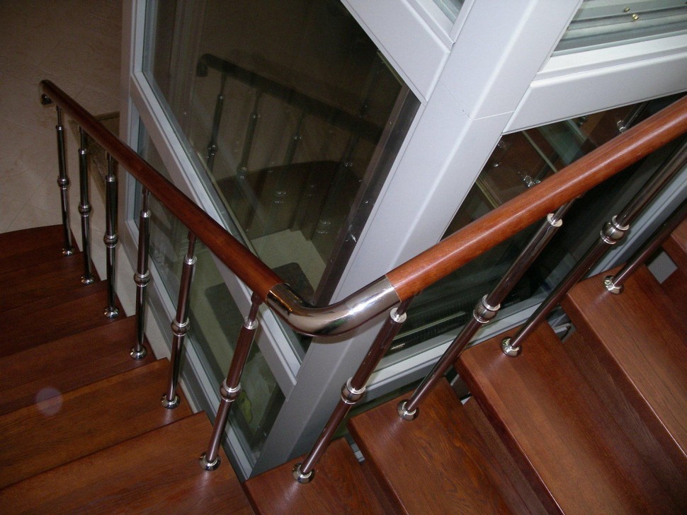 Нержавеющие ограждения без ригелей с круглым деревянным поручнем и стойками с деревянными вставками